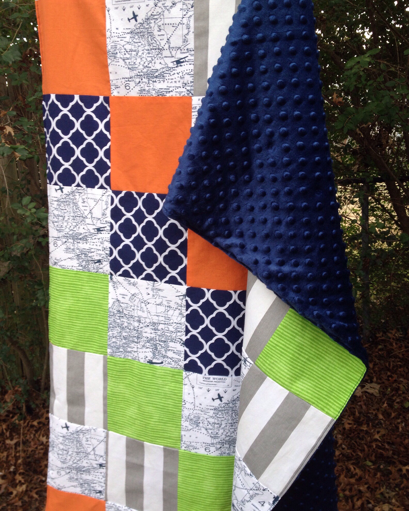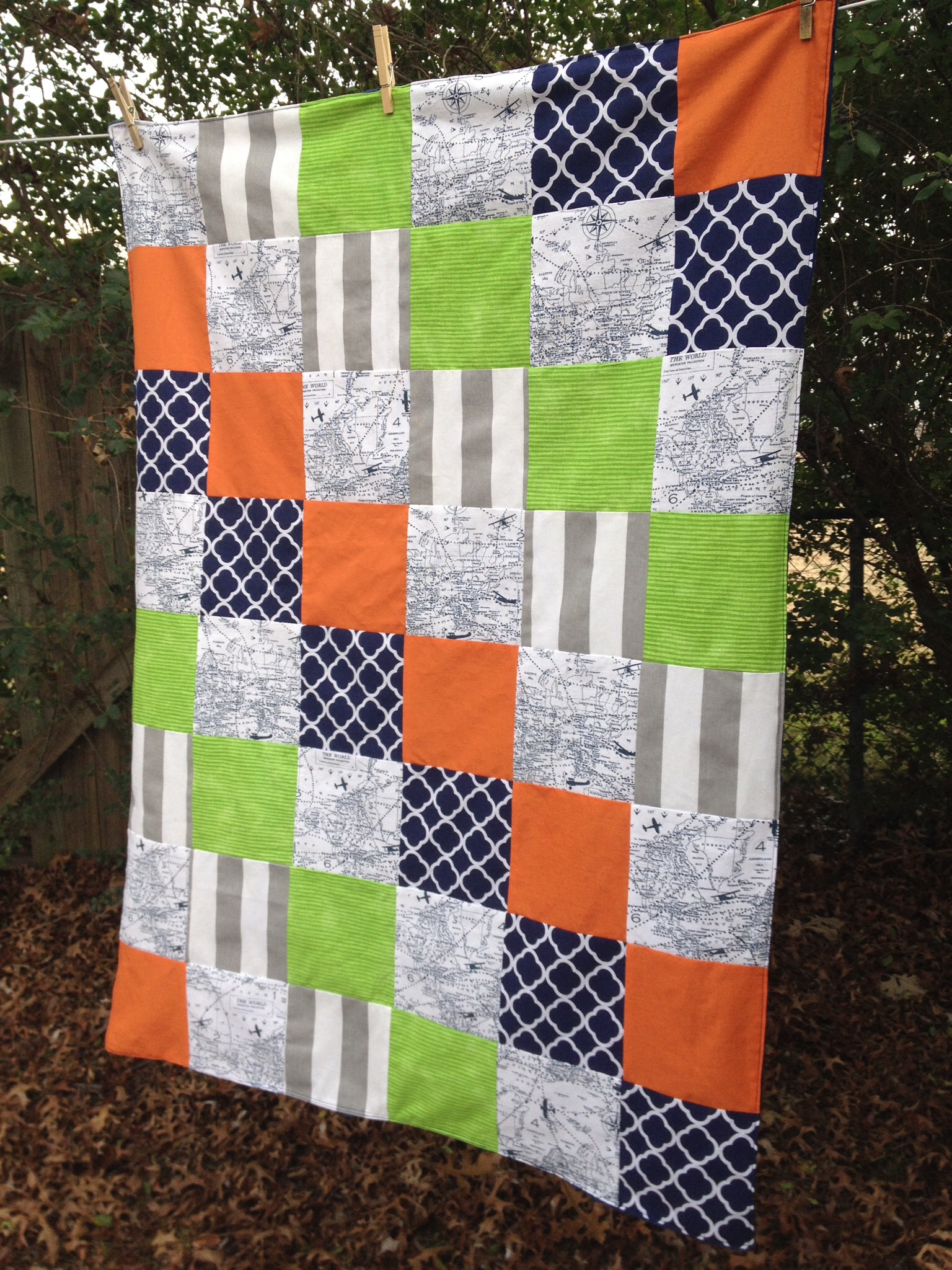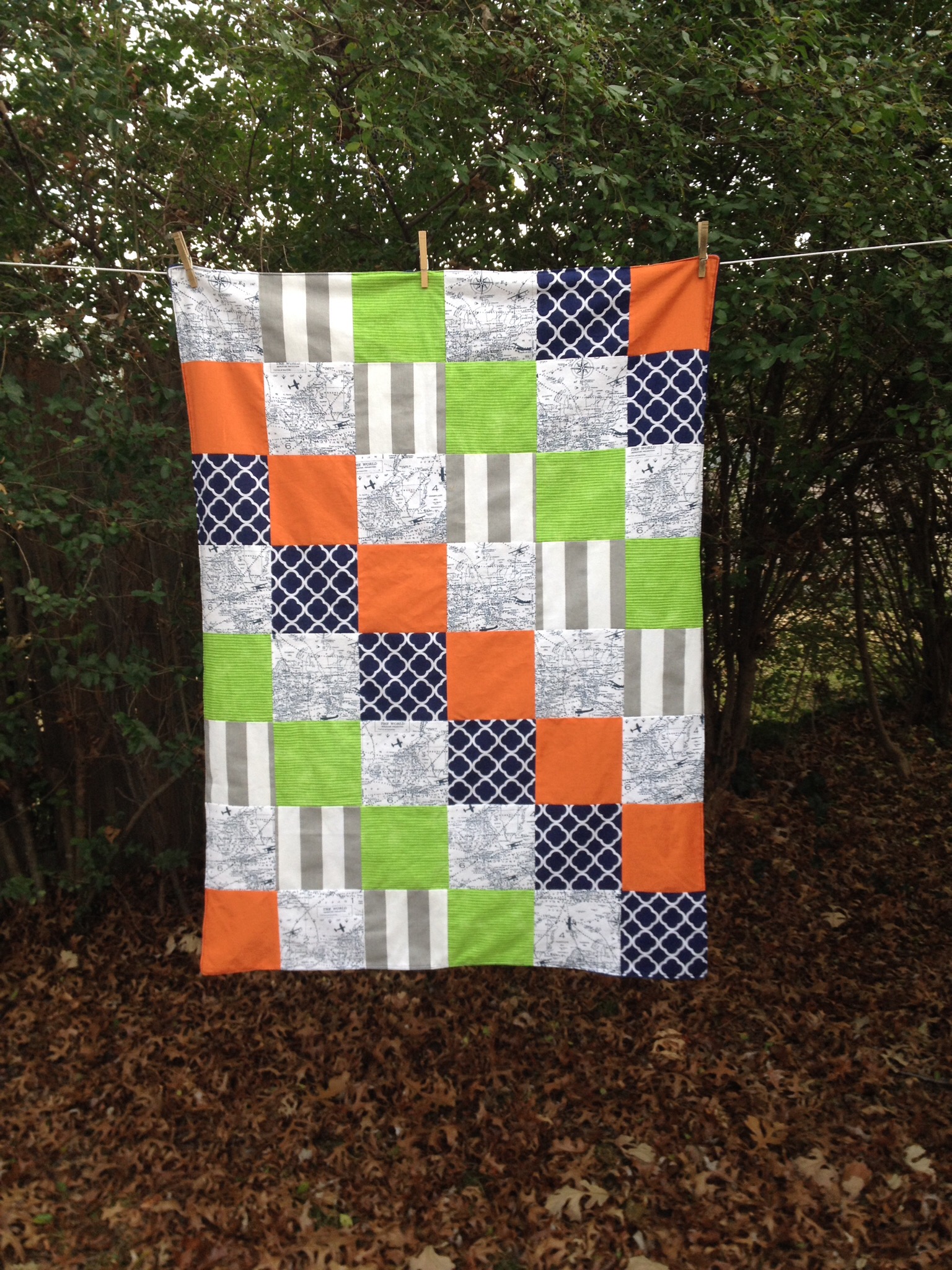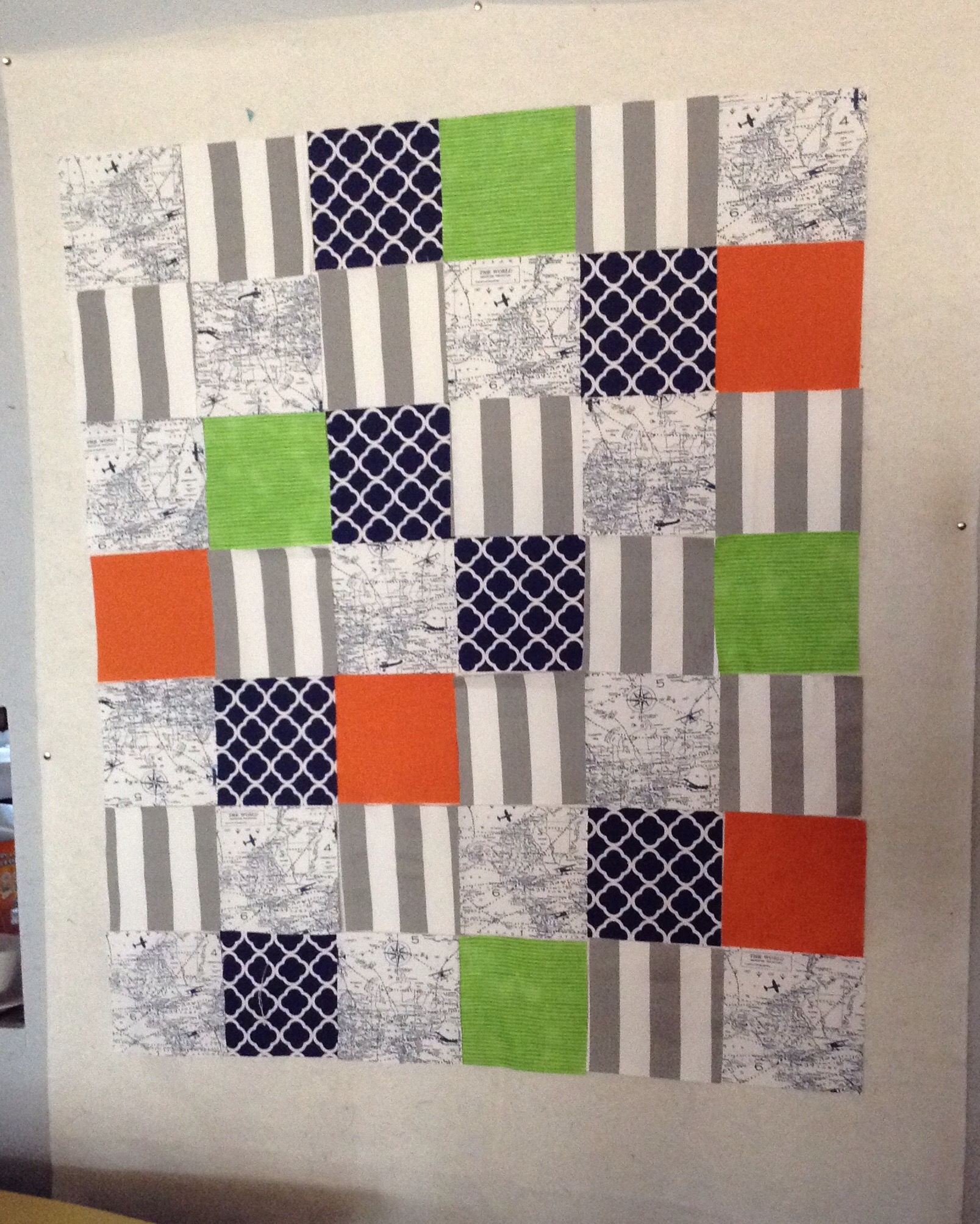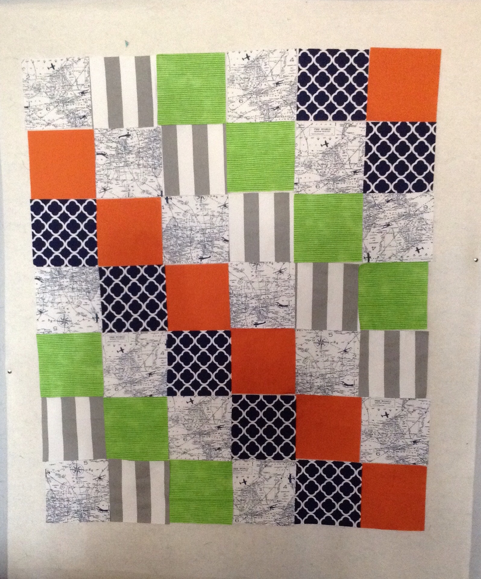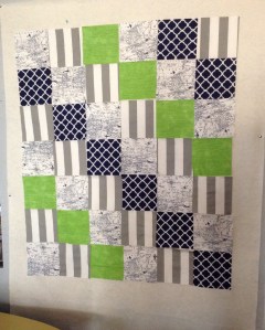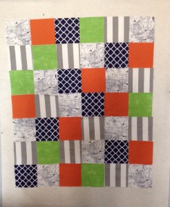 Sarah knew the general idea of what she wanted for her sweet little guy. With the fabric she picked I cut out the squares and arranged them in different patterns so she could choose her favorite.