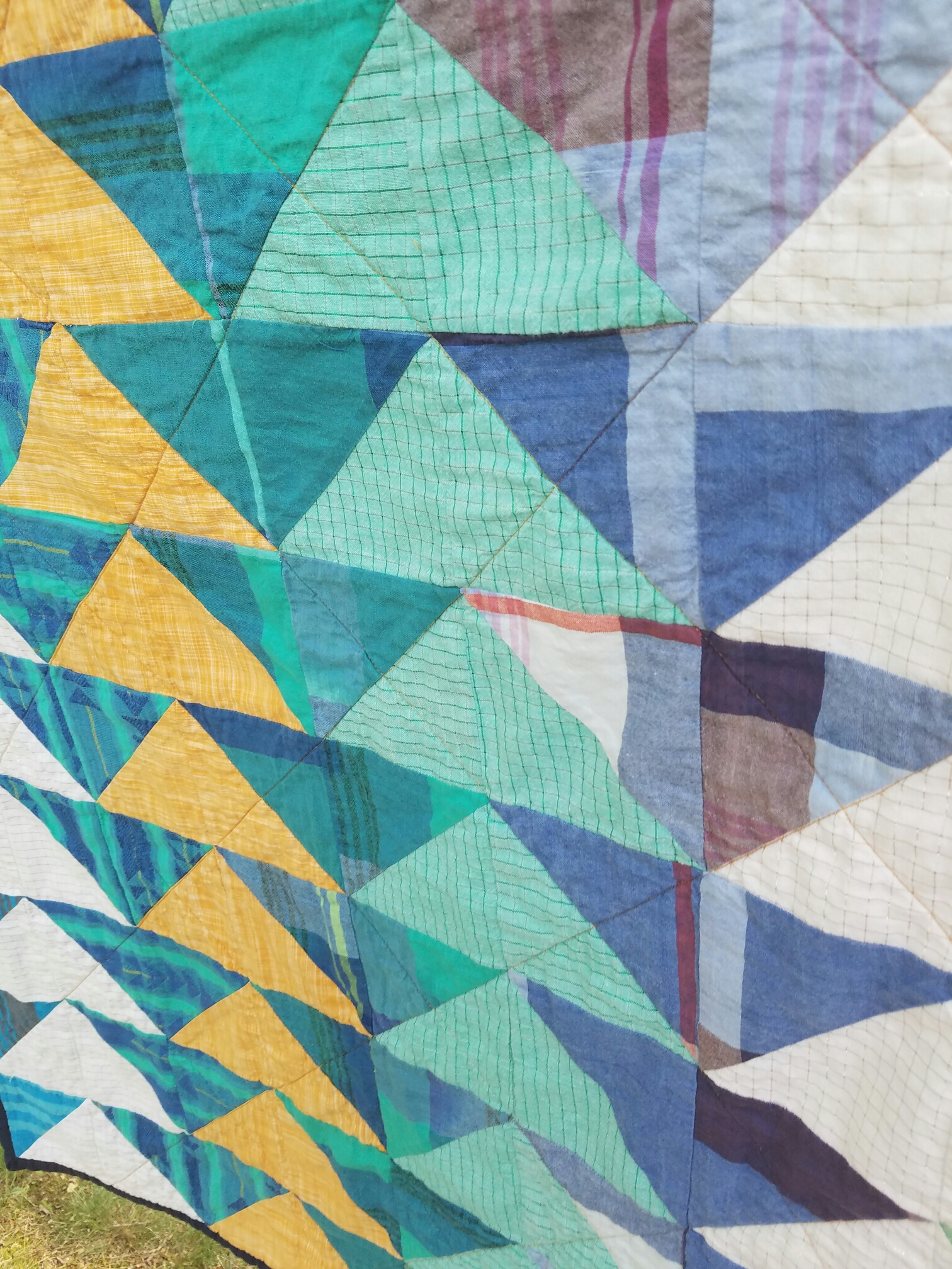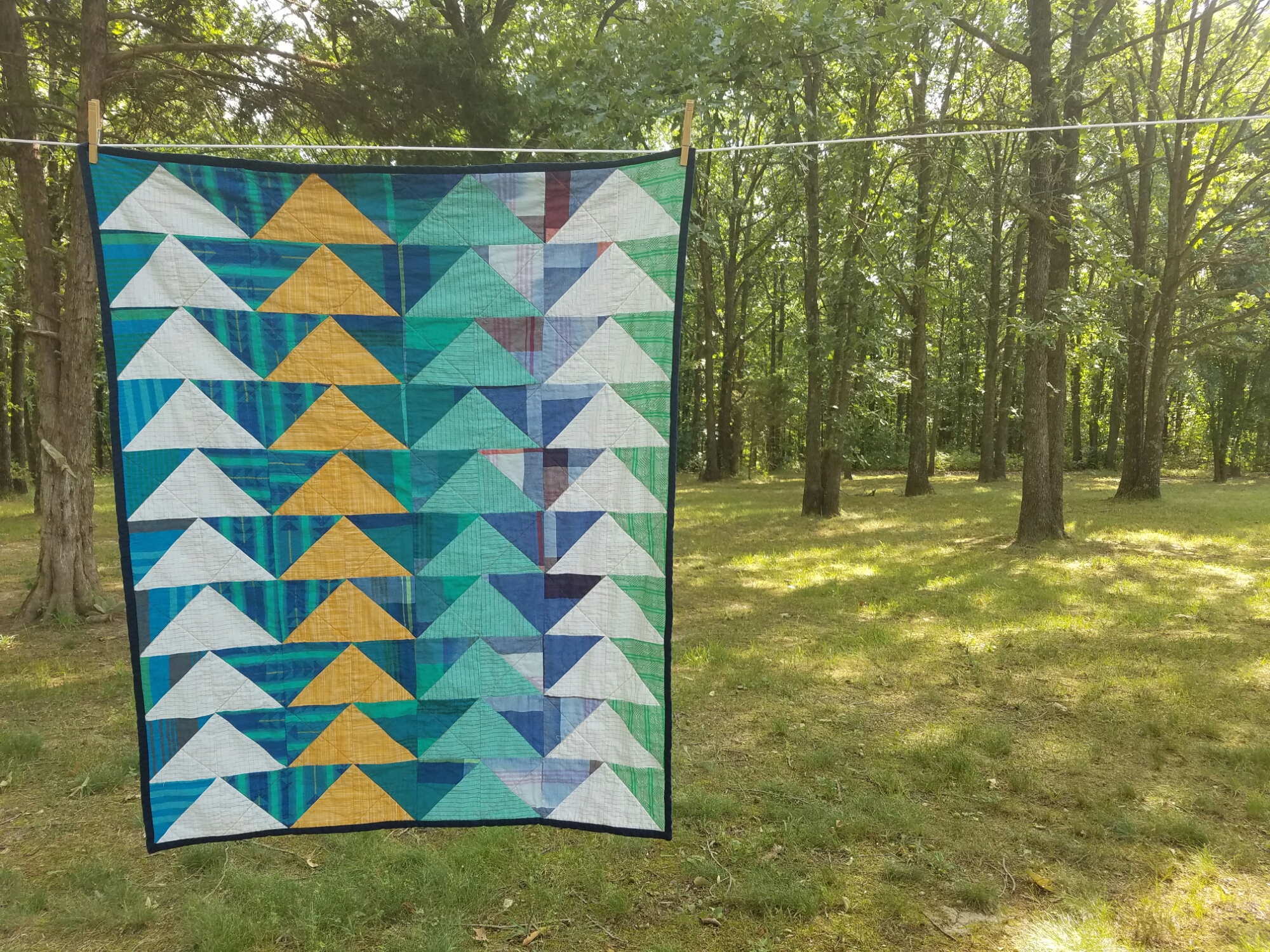 I had originally planned on using a random half square design, but once I got all of the blocks sewn and up on my design wall it all just looked too messy for my liking. After moving the blocks around in a few different designs and with some help from my good friend Jennifer I finally settled on a design. Unfortunately some of the fabrics I purchased didn’t make it into the final quilt, but I’m sure I’ll find good use for them in another project.