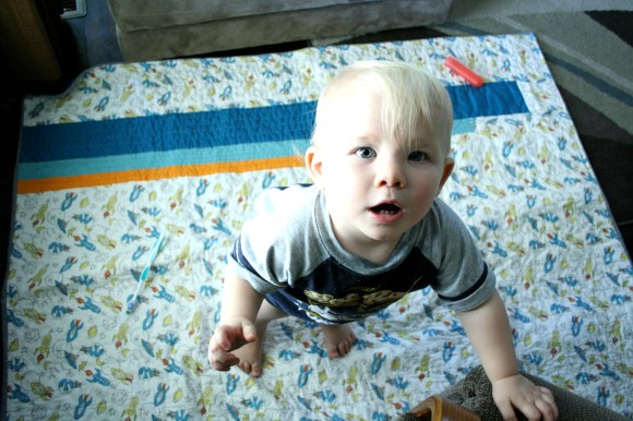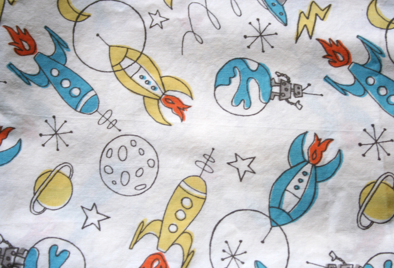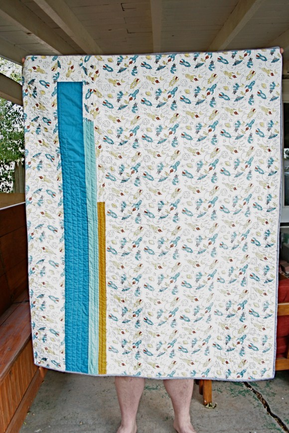 One of my dear friends from college, Chad, and his beautiful wife, Jil, just welcomed a handsome baby boy into their family. In honor of his arrival I just had to make…(what else?)….a quilt! Chad is a very accomplished sequential artist (check out his crazy drawing skills on his blog here) so I wanted to do something with a fun, comic-esque feel to it. After toying with some different ideas (super hero cape quilt?) I found this incredibly fun outer space patterned fabric and fell in love. Isn’t it just the best for a little boy?! Space ships, rockets, robots and planets. What could be more perfect?